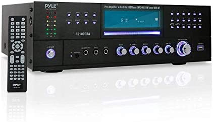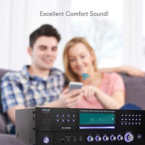 4-Channel Wireless Bluetooth Power Amplifier – 1000W Stereo Speaker Home Audio Receiver w/ FM Radio, USB, Headphone, 2 Microphone w/ Echo, Front Loading CD DVD Player, LED, Rack Mount – Pyle PD1000BA
