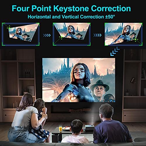 Convenient 4P/4D Keystone & 50% Zoom Out Function—This portable projector with both 4P and 4D keystone correction. No matter where the projector is, we could always adjust the image to rectangle on remote. It is with 100%-50% zoom out function. Without moving the projector, we could reduce the image size to 50%.It also has 360°flip function, support front, rear and ceiling projection.
