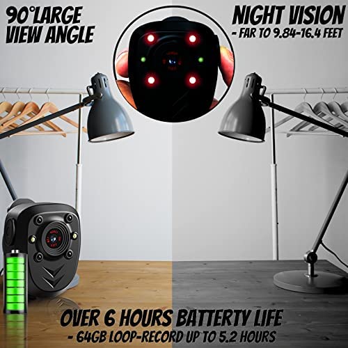 64GB Body Camera Police Civilians Patrol Portable Body Mounted Camcorder 1080P Night Vision 6 Hours Battery Life Audio Recording Wearable Video Recorder for Law Enforcement Indoor Outdoor Security