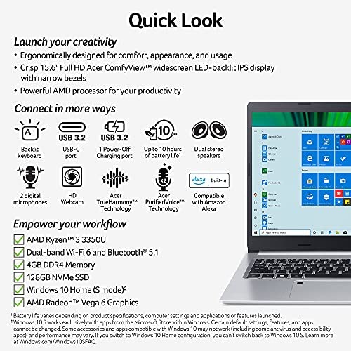 Acer Aspire 5 A515-46-R14K Slim Laptop | 15.6″ Full HD IPS | AMD Ryzen 3 3350U Quad-Core Mobile Processor | 4GB DDR4 | 128GB NVMe SSD | WiFi 6 | Backlit KB | Amazon Alexa | Windows 10 Home (S mode)