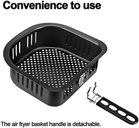 Easy to use: The non-stick replacement air fryer basket have a handle, which is easy to take out from air fryer oven.The handle of the air fryer oven basket is detachable.The nonstick coating easy to remove food! Perfect for making french fries ,snacks,pizza, onions,chicken wings, steak and fried vegetables multiple foods.