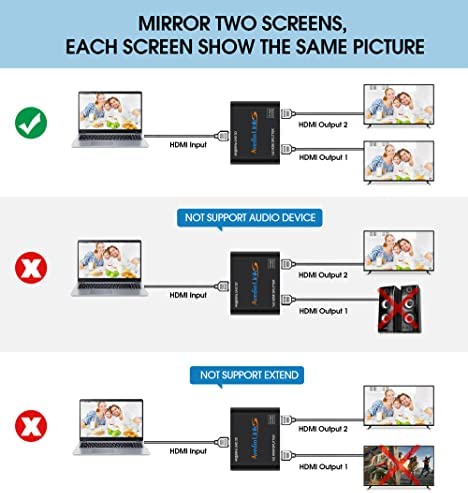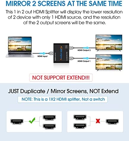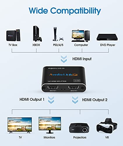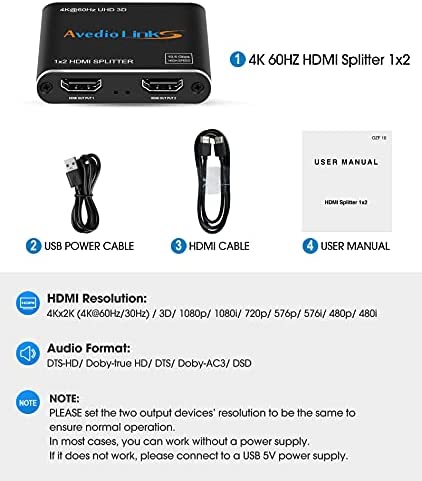 avedio links 4K@60Hz HDMI Splitter 1 in 2 Out, 2 Way HDMI Splitter for Dual Monitors, 1×2 HDMI 2.0 Splitter Video Distributor Mirror Only, Support Full HD 1080P 3D HDCP1.4 (HDMI Cable Included)