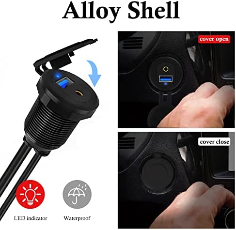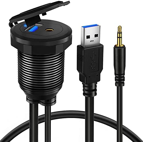 BATIGE Alloy USB 3.0 AUX DC3.5mm Port Car Mount Flush Cable for Car Boat Motorcycle Dash Panel with LED Indicator – 3ft