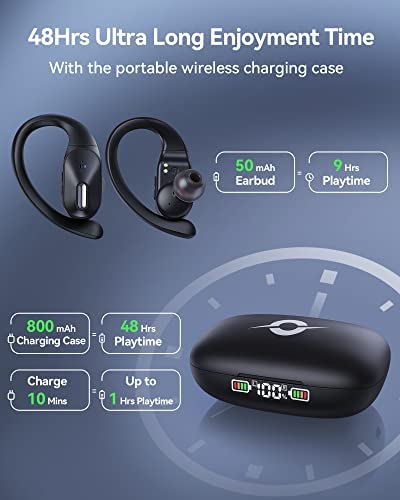 【Wireless Charging & 48hrs Play Time】These bluetooth headphones charging case supports both wireless charging and USB C charging.You could choose either of these two charging methods at any time for your convenience. The impressive 9 hours of listening time on a single charge for the sports wireless headphones are extended to a remarkable 48hrs of play time with the included charging case. In case of emergency, 10-minutes fast charging will give 1 hours of play time when battery is low.