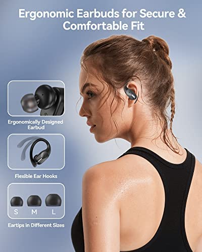 【Snug Comfortable Design & IPX 5 WaterProof】These sport wireless earphones are ergonomically designed to provide a snug fit while ensuring fatigue-free and long-lasting comfort. The flexible earhooks snugly fit your ears without falling out even for intense workouts. There are eartips in 3 sizes(S/M/L) for your choice to get the most suitable fit.The IPX5 waterproof design protects your wireless earphones from sweat and splashes, which is ideal for sports, gym, workout, Hiking,etc.