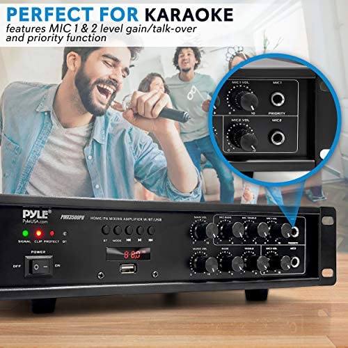 Features: – Bluetooth Wireless Streaming Ability – Built-in USB Playback – LED Display – USB Flash Drive & SD Memory Card Readers – Aux Input – MP3/MIC/AC-3 Inputs – Digital LED Display – Microphone 1 and 2 Level Gain and Talk-over Control – Microphone 1 Priority function – Mic Talk-over Ability to Speak Over Audio, Karaoke Style – Desktop Home/PA Mixing Power Amplifier – Compact Home Theater-Stereo Receiver Style – Built-in Bluetooth for Wireless Music Streaming – Optical/Coaxial Digital Signal Inputs – Aux Audio Input Selection – MP3/WAV Audio Files Support – Connect & Stream Audio from External Devices – Front Panel Audio Control Center – Treble, Bass, Master & Microphone Volume Adjustable Bluetooth Connectivity: – Receives Wireless Signal for Audio Streaming – Simple & Hassle-Free Pairing Setup – Integrated Antenna for Extended Wireless Range – Works with All of Today’s Latest Devices – (Smartphones, Tablets, Laptops, Computers, etc.) – Bluetooth Version: 5.0 – Bluetooth Network Name: ‘Pyle Speaker’ – Wireless Range: 40’+ Ft. What’s in the Box: – Desktop Stereo Amplifier – Remote Control – FM Antenna Technical Specs: – Power Output: 500 Watts Peak Power – Remote Control Battery: Need 2x ’AAA’ Battery (not included) – MAX Power Output: 50 Watt x2(@ 4 Ohm) – RMS Power Output: 35 Watt x 2 (@ 4 Ohm) – Tone Control: Bass, f=100Hz +/-12dB, Treble, f=10 KHz +/-12dB – Tone Control for Mic: Bass, f=100Hz +/-8dB, Treble, f=10 KHz +/-8dB – Frequency Adjustment: +/-2dB – Signal to Noise Ratio: >71dB – T.H.D.: 45dB – Radio Station Presets: Up to 40 Stations – Power Supply: 120V/240V, Switchable – Dimensions (L x W x H): 11.81” x 9.45” x 2.76” -inches.