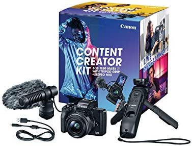 Canon EOS M50 Mark II Content Creator Kit, Mirrorless 4K Vlogging Camera Kit Includes EF-M 15-45mm Lens, Tripod Grip, Stereo Microphone