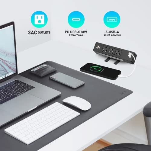 【Attached 6.5 ft Extension Cord Cable】the unique desk clamp attaches the outlets accessories right to the side of your desk, counter, or workbench providing easy access to AC power. 6.5 ft AC power cord of the desktop power hub passes through the back of the clip to avoid cable mess.