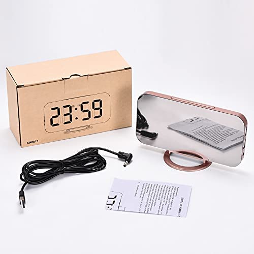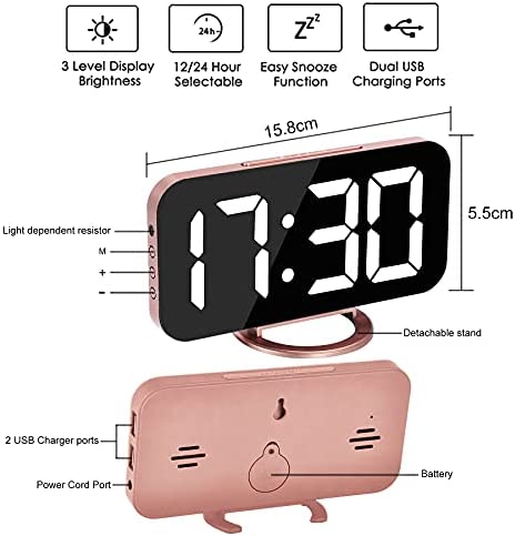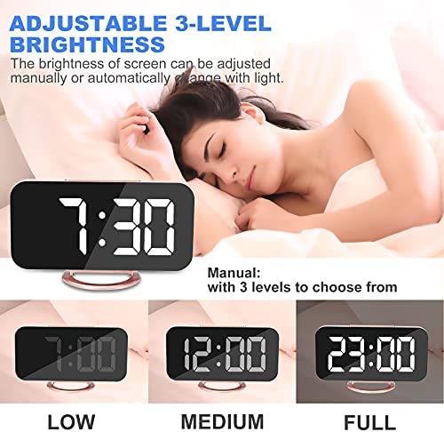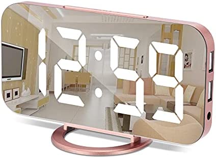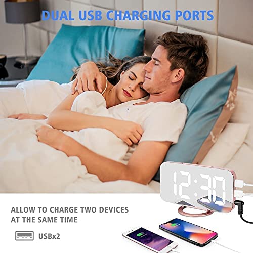 Digital Alarm Clock,6.5 Inch LED Mirror Electronic Clocks,with 2 USB Charging Ports,3 Adjustable Brightness,Snooze,12/24H,Night Mode,for Bedroom Home Office (Rose Gold)