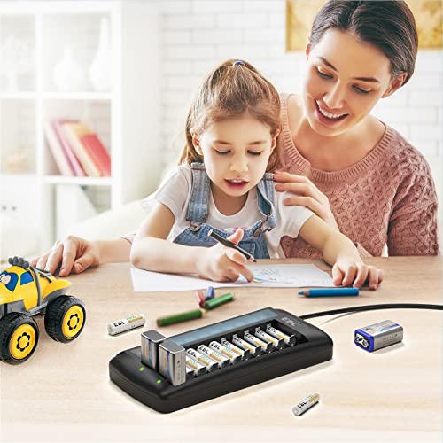 Upgraded Charging freely – Independent charging channels smart charger, can charge 1-10 pieces AA/AAA Ni-Mh/Ni-CD rechargeable batteries and 1-2 pieces 9V Ni-Mh/Ni-CD/Li-ion rechargeable batteries