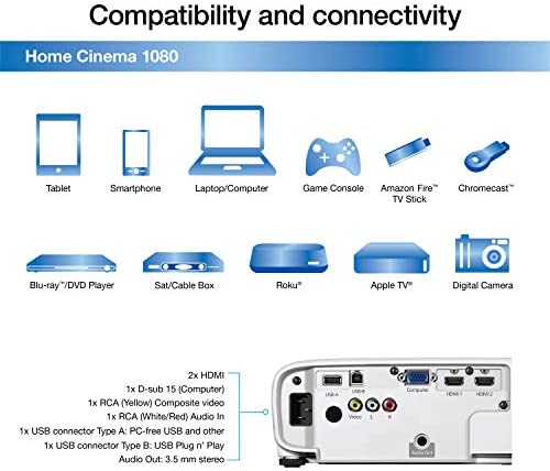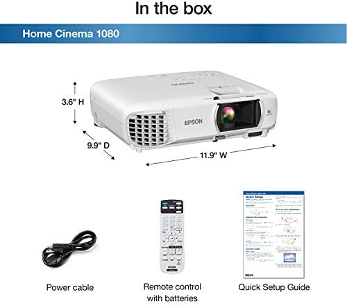 “Enhance your home theater with state-of-the-art projection. Featuring proprietary core technologies, the Home Cinema 1080 delivers an astounding 1080p picture up to 320″” on virtually any blank wall or screen. Whether you’re binge-watching your favorite TV show or watching the big game, this dynamic, versatile projector provides a stunning, larger-than-life viewing experience with true 3-chip, 3LCD technology, Best-in-Class Color Brightness (1) and fast data processing. And, with versatile connectivity and easy setup, you get immersive HD entertainment right out of the box — simply power on the projector and start streaming games, movies and more (2).1. Color brightness measured per IDMS 15.4. Additional colors and picture modes tested. Top-selling Epson 3LCD projectors vs. comparable top-selling 1-chip DLP projectors based on NPD sales data for May 2017 – April 2018. COLOR BRIGHTNESS WILL VARY BASED ON USAGE CONDITIONS.2. Some apps require paid subscriptions.3. Color brightness (color light output) and white brightness (white light output) will vary depending on usage conditions. Color light output measured in accordance with IDMS 15.4; white light output measured in accordance with ISO 21118.4. For convenient and reasonable recycling options. SmartWay is an innovative partnership of the U.S. Environmental Protection Agency that reduces greenhouse gases and other air pollutants and improves fuel efficiency”.