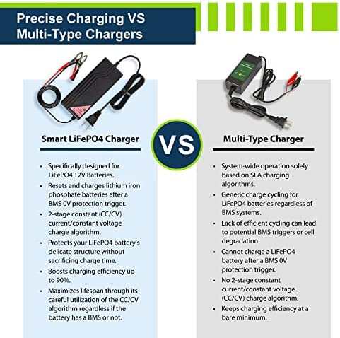 Intelligently Programmed: Our charger is uniquely designed for 12V LiFePO4 batteries, implementing the special 2-stage constant current/constant voltage (CC/CV) charge algorithm with smart LED indicators. Additionally, the charger is designed to reset all types of BMS when active by allowing current into batteries reading from down to 0V