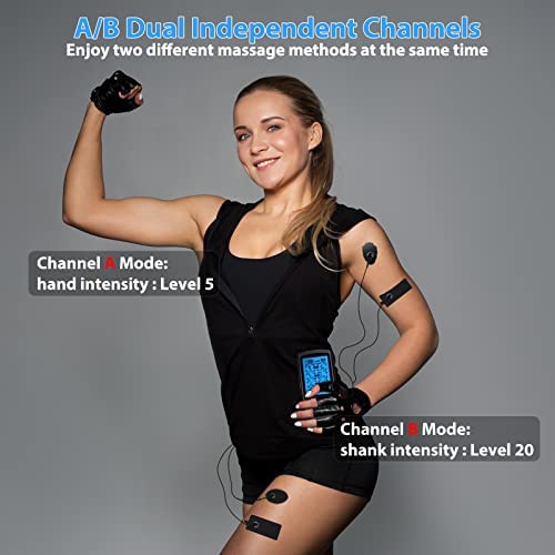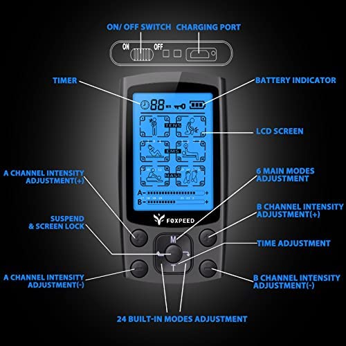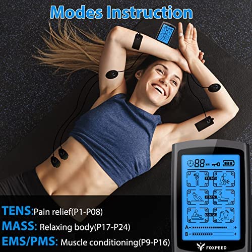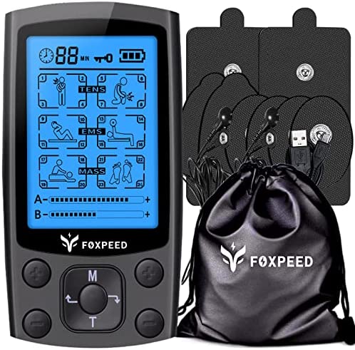FOXPEED Dual Channel Electric TENS Unit Muscle Stimulator with 24 Modes and 20 Intensities of Pulse Massager, Used to Relieve Pain, Rechargeable TENS Machine Massager for Workout & Travel