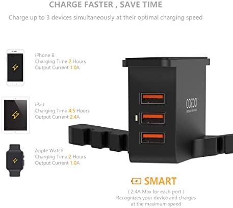 3 Port Smart USB Charger:Detects your device automatically to deliver its fastest possible charge speed up to 2.4 amps per port or 4 amps overall.