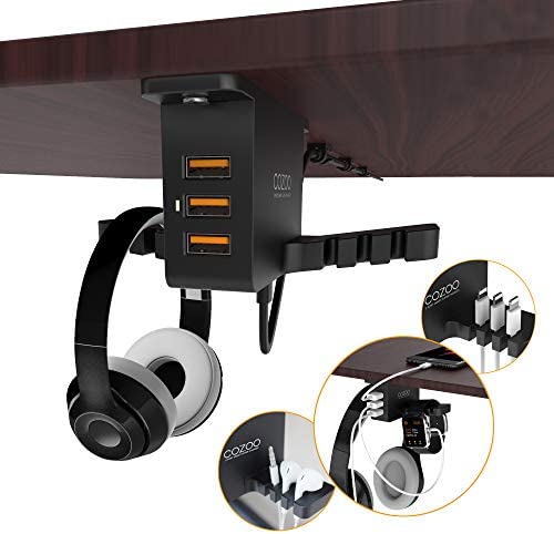 Headphone Stand with USB Charger COZOO Under Desk Headset Holder Mount with 3 Port USB Charging Station and iWatch Stand Smart Watch Charging Dock Dual Earphone Hanger Hook,UL Tested