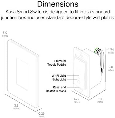 Control your lights, ceiling fans, and other fixtures from anywhere with the HS200. The smart switch replaces any standard light switch, and connects to your home Wi-Fi in no time through the free Kasa app. Kasa also lets you manage connected fixtures with your smartphone or tablet, including setting schedules, timers and countdowns. For added convenience, you can use your voice to control the HS200 when paired with works with Amazon Alexa, Google assistant and Microsoft cortana.Input Voltage: 100 – 120 VAC, 50/60 Hz, 15 A.
