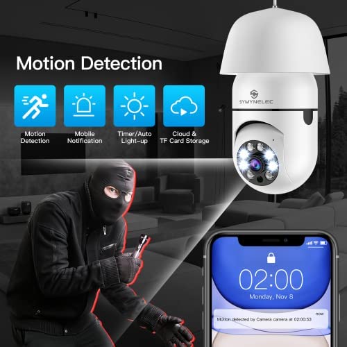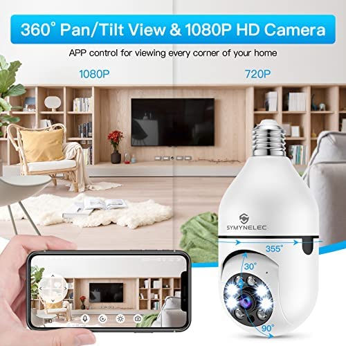 Light Bulb Security Camera, SYMYNELEC 360 Degree Pan/Tilt Panoramic IP Camera, 2.4GHz WiFi 1080P Smart Home Surveillance Cam with Motion Detection Alarm Night Vision Two Way Talk Indoor Outdoor E27