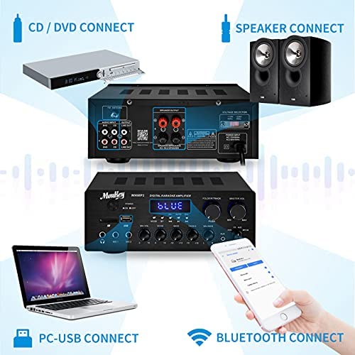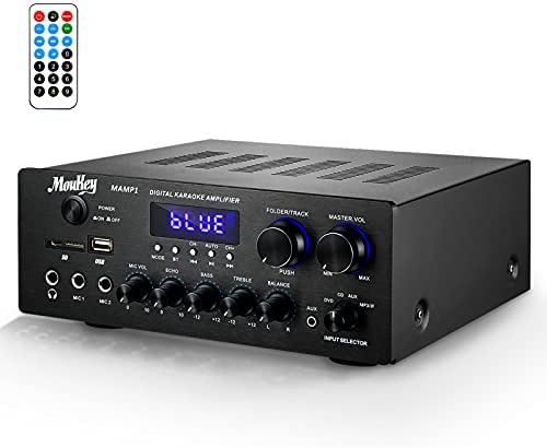 Moukey Home Audio Amplifier Stereo Receivers with Bluetooth 5.0, 220W 2 Channel Power Amplifier Stereo System, w/USB, SD, AUX, MIC in w/Echo, LED for Home Theater Speakers via RCA, Studio Use – MAMP1