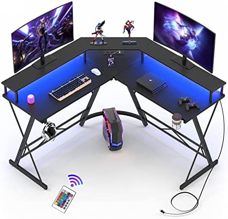 Mr IRONSTONE Gaming Desk with Led Lights and Power Strip L Shaped Desk Corner Computer Desk with Monitor Stand, Carbon Fiber Surface Gaming Table with Desk Accessories Cup Holder Headphone Hook, Black