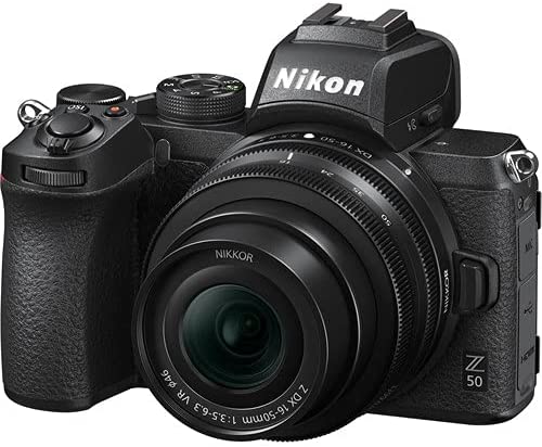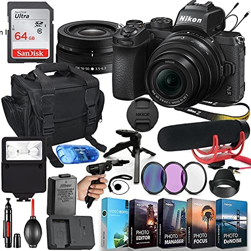 Nikon Z 50 Mirrorless Digital CameraFEATURES:20.9MP DX-Format CMOS SensorEXPEED 6 Image ProcessorUHD 4K and Full HD Video Recording2.36m-Dot OLED Electronic ViewfinderThis Nikon Camera Bundle Includes:Nikon Z 50 Mirrorless Digital CameraNikon NIKKOR Z DX 16-50mm f/3.5-6.3 VR Lens (Black)Nikon EN-EL25 Rechargeable Lithium-Ion Battery (7.6V, 1120mAh)Nikon MH-32 Battery ChargerNikon UC-E21 USB Type-A Male to Type-B Micro Male Cable (Black)Nikon AN-DC20 Camera StrapNikon BF-N1 Body CapDK-30 Rubber EyecupBundled Accessories:Rode VideoMic GO Camera-Mount Shotgun MicrophoneSandisk 64GB Ultra High Speed Class 10 SDXC Memory CardShoulder BagHand Grip TripodDigital Slave Flash3 Piece HD Filter Kit – UV – CPL – FLDTulip Lens Hood5 Piece Video/Photo Editor Suite compatible with MAC/Windows OS – Digital DownloadUSB Card ReaderLens Pen and BlowerLens Cap Keeper