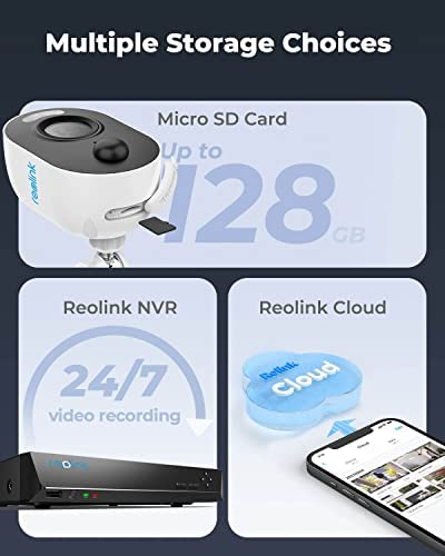 MULTIPLE RECORDING OPTIONS WITHOUT FEE: Insert a micro SD card (up to 128GB, not included) to save motion-triggered events, choose 24/7 continuous recording with Reolink NVR (optional), or customize scheduled recording. Get a free 7-day basic plan and upload your videos to Reolink Cloud.