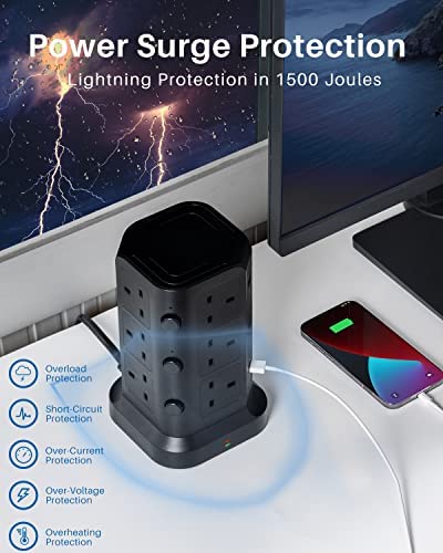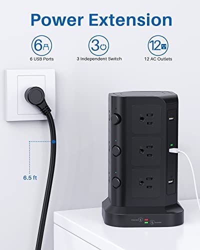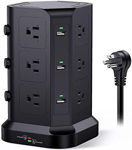 Power Strip Tower by KOOSLA, [15A 1500J] Surge Protector – 12 AC Multiple Outlets & 6 USB Ports, Flat Plug 14 AWG Heavy-Duty Extension Cord 6.5ft, Home Office Supplies, Dorm Room Essentials Black