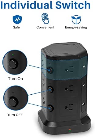 【18 IN 1 Power Strip- Integrating 12 Outlets & 6 USBs together】 KOOSLA tower power strip, the answer to all your charging needs, is a versatile, sophisticated, and intelligent charging dock. It integrates 12 AC outlets and 6 USB charging ports within one charging station, allowing you to connect and charge up to 18 devices simultaneously, even where space is limited. It is an ideal all-in-one solution.