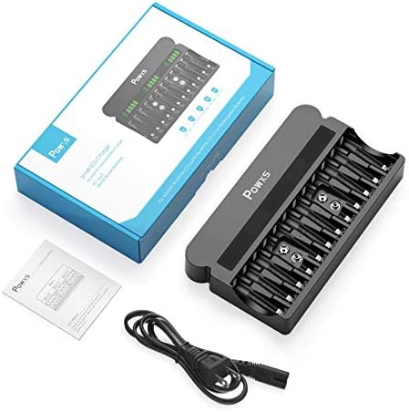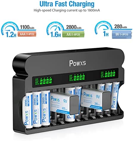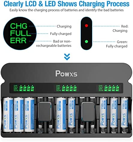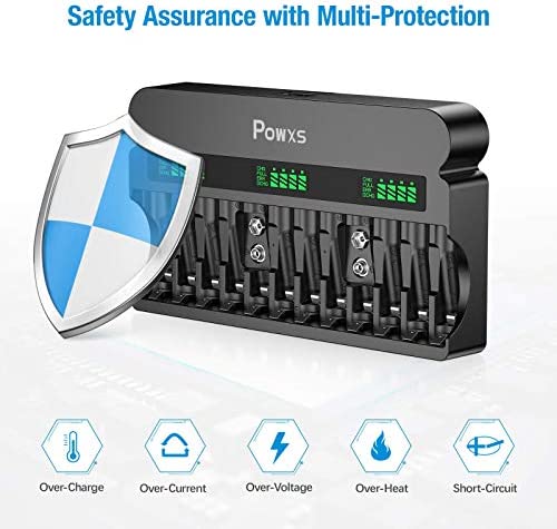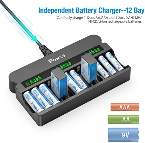 POWXS Rechargeable AA AAA 9V Battery Charger, High-Speed Battery Charger for 1.2V Ni-MH Ni-CD AA AAA 9V Rechargeable Batteries and 9V Lithium ion, 12 Bay Independent Charging ( Include AC Cable