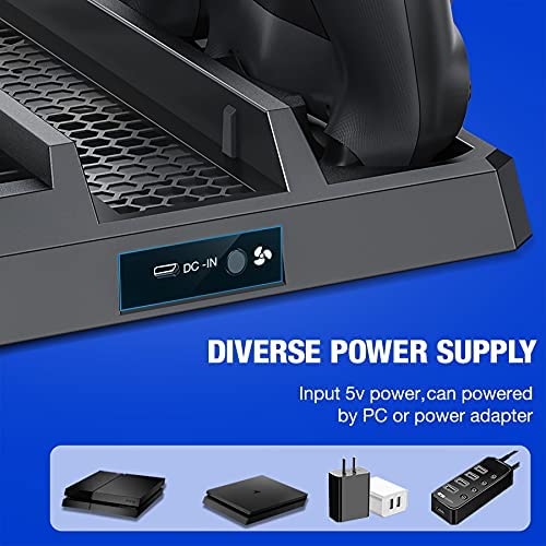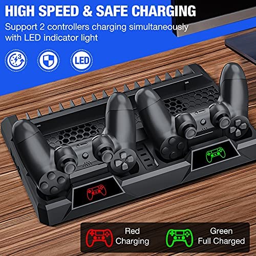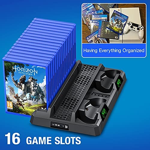 PS4 Stand Cooling Fan for PS4 Slim/PS4 Pro/PlayStation 4, PS4 Stand Vertical Stand Cooler with Dual Controller Charge Station & 16 Game Storage, PS4 Organizer Stand with Game Storage PS4 Accessories
