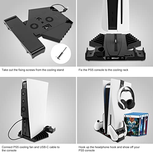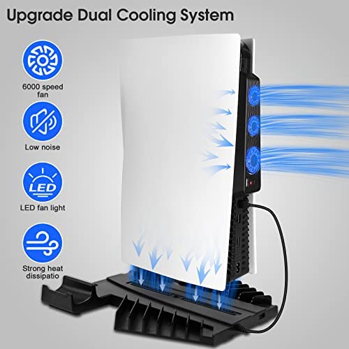 PS5 Cooling Stand with Controller Charger Station Accessories and Headset Holder, Dual Cooler Fan for Playstation 5 Console, Vertical Cooling Charging Dock with Adjustable Wind Speed&12 Game Storage