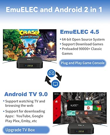š®ćAndroid TV 9.0&EmuELEC 4.5 Systems In 1ćRealize playing games, watching TV, browsing the web, downloading APP, etc. on one super console. Your emulator console is set to always boot into game first, if you want to boot into Android TV 9, just toggle it in the main menu.