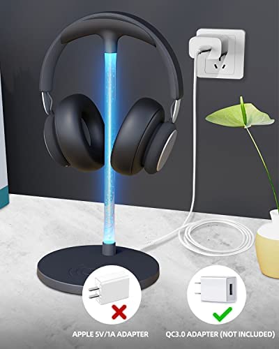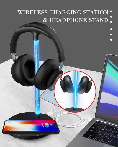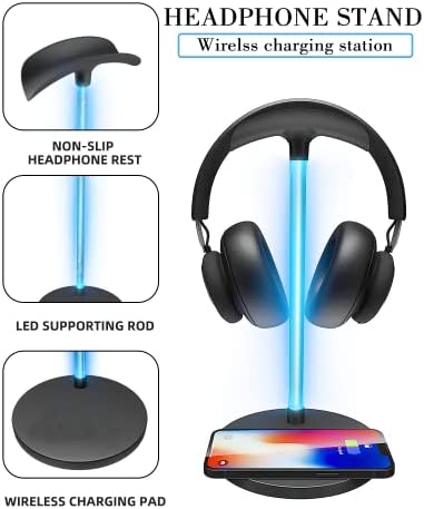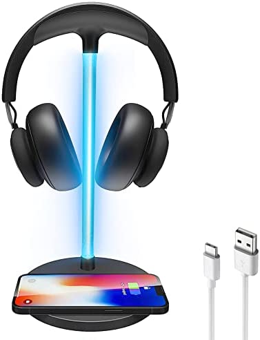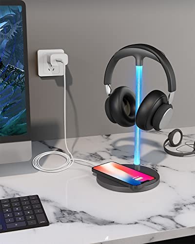 RGB Headphone Stand with 15W Wireless Charger, Uineer Desk Gaming Headset Holder Hanger Rack with QI Wireless Fast Charging Pad, for Computer Gaming Gamer Accessories, Black