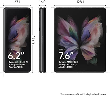 See more and do more with the Samsung Galaxy Z Fold3 smart phone, that has the ultimate foldable screen putting a workspace, theater, and game room right in your pocket. The sleek cover display unfolds to double the size, providing one expansive 7.6” edge-to-edge display that’s like a tablet. Our first-ever Under Display Camera provides an incredible uninterrupted view. We’ve put an ultra dynamic AMOLED display on our super expansive screen. Work and play in any light with a high-contrast ratio and an adaptive 120 Hz refresh rate on the main screen, plus intuitive blue light management that automatically adjusts based on the time of day. Work smarter not harder and from virtually anywhere on this powerful multifaceted cellphone that makes multitasking a breeze. Drag and drop text, pictures, and graphs across different apps. Or pull up multiple docs at once to reference and edit at the same time. And now with our revolutionary S Pen, you can even jot down notes while video calling. Send an email in a flash, enjoy smooth gaming, and upload every moment with 5G connectivity. Galaxy Z Fold3 is water-resistant and made with our strongest aluminum frame for enhanced protection. Unfold a new world of benefits with exclusive Z Premier perks, created just for Galaxy Z owners. Measured diagonally, the screen size is 7.6″ in a full rectangle and 7.4″ accounting for the rounded corners. The actual viewable area is smaller due to the rounded corners and camera hole. Compatible with S Pen Fold Edition and S Pen Pro only, sold separately. Works with main display only. Multi Active Window works with select applications; compatible apps growing through third party developers. Drag and drop functionality works with select applications. 5G speeds vary and require optimal network and connection (Factors include frequency, bandwidth, congestion); see carrier for available. Super fast (25 W) charger sold separately. Use only Samsung approved chargers and cables; do not use any worn or damaged chargers or cables; incompatible charger or cable can cause serious injuries or damage to your mobile device. Has an official IPX8 rating. Water resistant in up to 5 feet of freshwater for up to 30 minutes. Rinse residue/dry after wet.