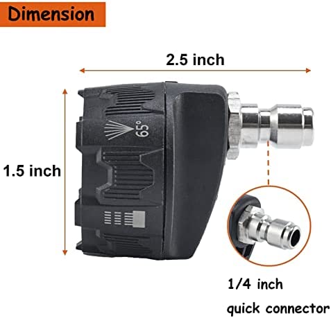 6-1 Pressure Washer NozzleMax pressure: 2500 psi.6 Different cleaning mode: soap, rinse, 0 , 15 , 25 , 40, 65 degree, soap.Fitting: 1/4 inch quick connector. -The detents between the different fan settings are flexible and strong.-Faster and easier than storing and looking for individual ones.-Saves your time and energy.-Ideal for cleaning concrete sidewalk, steps, wood deck, wall, shed and car.