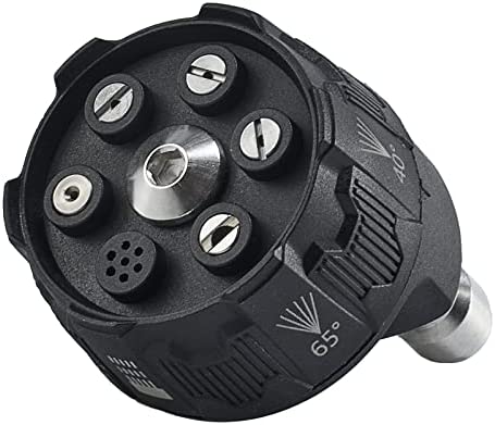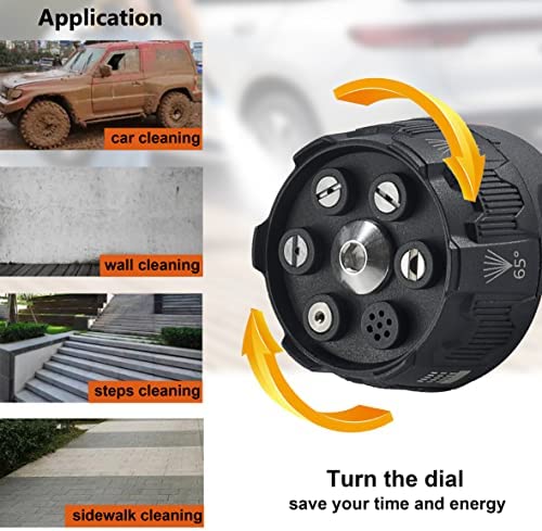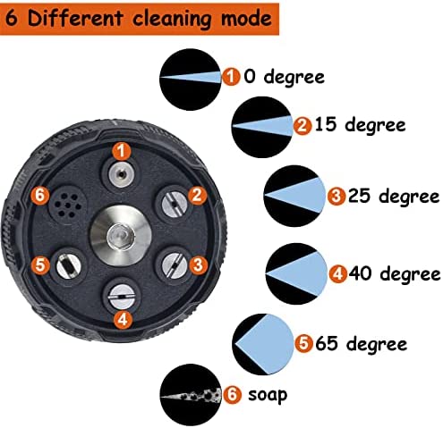 Pressure washer nozzle is faster and easier than storing and looking for individual ones. Easy to turn to access 6 different cleaning mode: 0 , 15 , 25 , 40, 65 degree, soap.