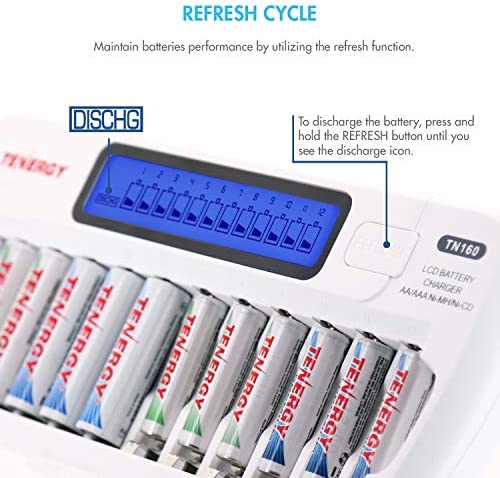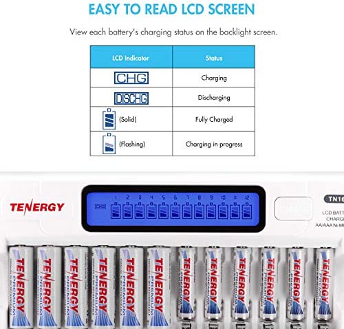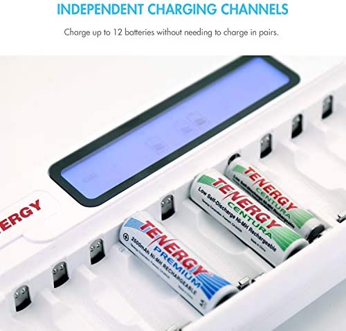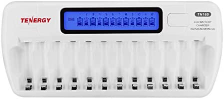 Tenergy TN160 LCD Battery Charger 12-Bay Smart Battery Charger for AA/AAA NiMH/NiCd Rechargeable Batteries Charger with Refresh Function Household Battery Charger w/AC Wall Adapter