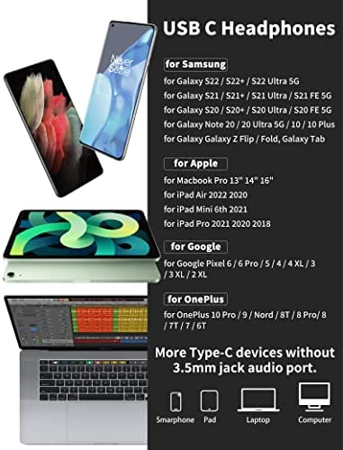 USB C Headphones: type c earbuds for Samsung Galaxy S22/S22+/S22 Ultra/S21 FE 5G/S21/S21+/S21 Ultra/S20 FE/S20 Ultra/S20+/S20, Galaxy A53/A33, Galaxy Z Flip 4/3/2, Fold 4/3/2, Galaxy Tab S8/S8+/S8 Ultra 5G/S7/S6/S5e, Note 20/20+ /20 Ultra/10/10+, for OnePlus 10T/10 Pro/9/Nord/8T/8/7T/7/6T, for Google Pixel 6a 6 6 Pro 5 4 3 2 XL, for Macbook Pro 13″ 14″ 16″, for iPad Air 2020 2022, Pro 2021/2020/2018, Mini 6th 2021, for motorola edge (2021), for moto razr 2 5G (2nd gen 2021), more USB-C device