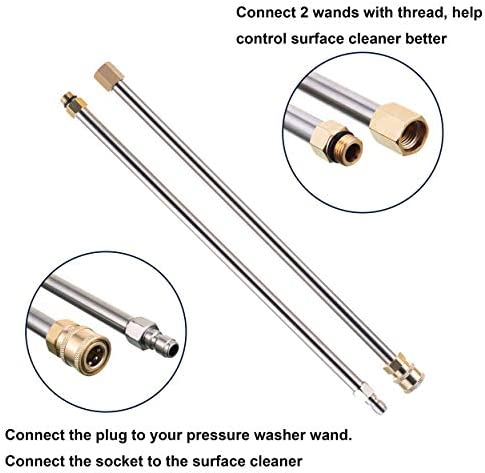 Pressure washer extension wands: The length of each wand is 15”. 2 wands are connected with thread to avoid leakage at the connection. The end of the wand is 1/4″ quick connect fitting, suitable for most pressure washer attachments with 1/4″ quick connect.