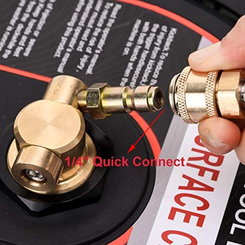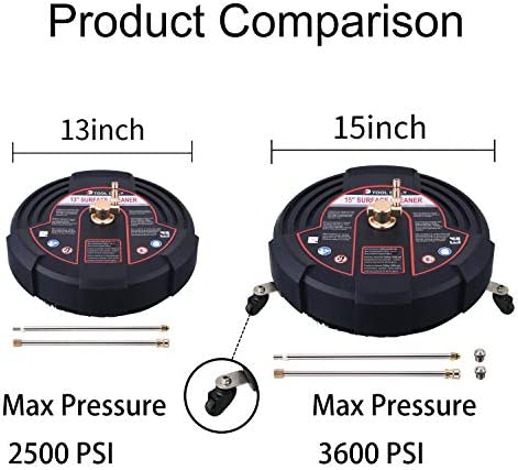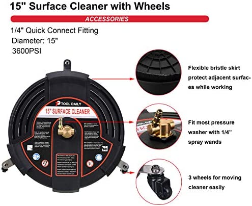 Surface cleaner for pressure washer: The surface cleaner is installed with 3 wheels that help power washer surface cleaner move easily and flexible on large area. Flexible bristle skirt protect adjacent surfaces and resist water splash out while working. Working pressure is up to 3600 PSI. 1/4” standard quick connect fitting. Dimension of the surface cleaner is 15” X 15” X 3.9”.