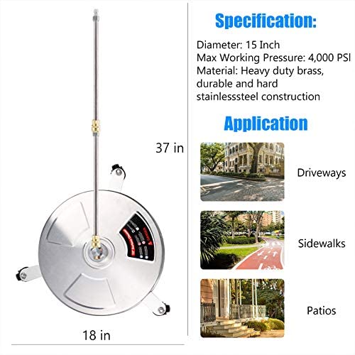 Package Include: Pressure washer surface cleaner attachment included: 1 x 15 inch stainless steel surface cleaner, 1 x 15 extension wands, 2 x replacement nozzles, 4 x O-rings, 1 x thread seal tape, 1 x nozzle cleaner. Working pressure is up to 4000 PSI. Required min pressure 2000 PSI, min flow rate 1.8 GPM, max flow rate 3.7 GPM.