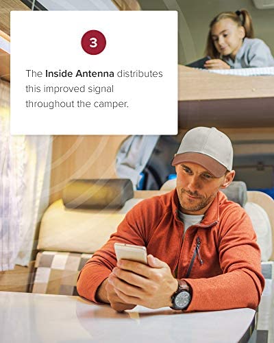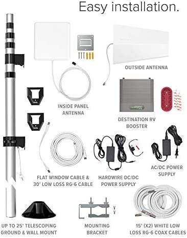 The weBoost Destination RV improves cell coverage inside large trailers and campers. It includes an outside directional antenna, telescoping pole, inside panel antenna, and powerful booster to improve cell coverage when stationary. This booster will amplify any cell signal technology, including 5G, on bands 12/17, 13, 5, 4, and 25/2.