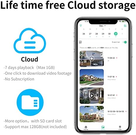 【All in one camera】This wireless camera outdoor camera,with life time free 7-days playback,video saved in cloud server(Max 1GB). Support max 128G (SD card not included).You could 2-way talk, playback,motioin detection,rotate angle,even when outside